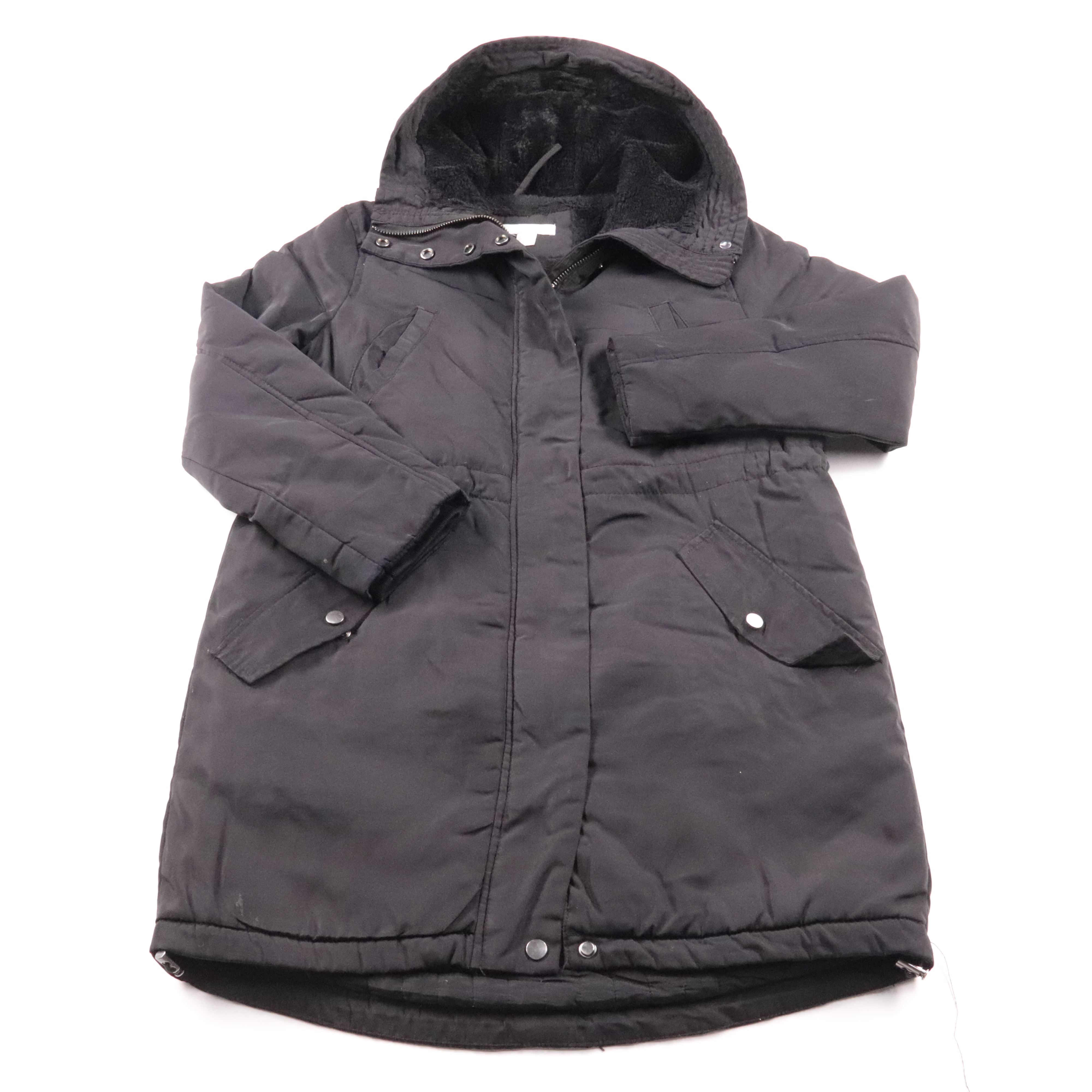 Зимняя удлинённая куртка H&M чёрного цвета с капюшоном и тёплой подкладкой. Подойдёт для повседневных прогулок и поездок в холодную погоду, есть удобные карманы с клапанами на кнопках. Практичное преимущество — застёжка на молнию с планкой на кнопках л...