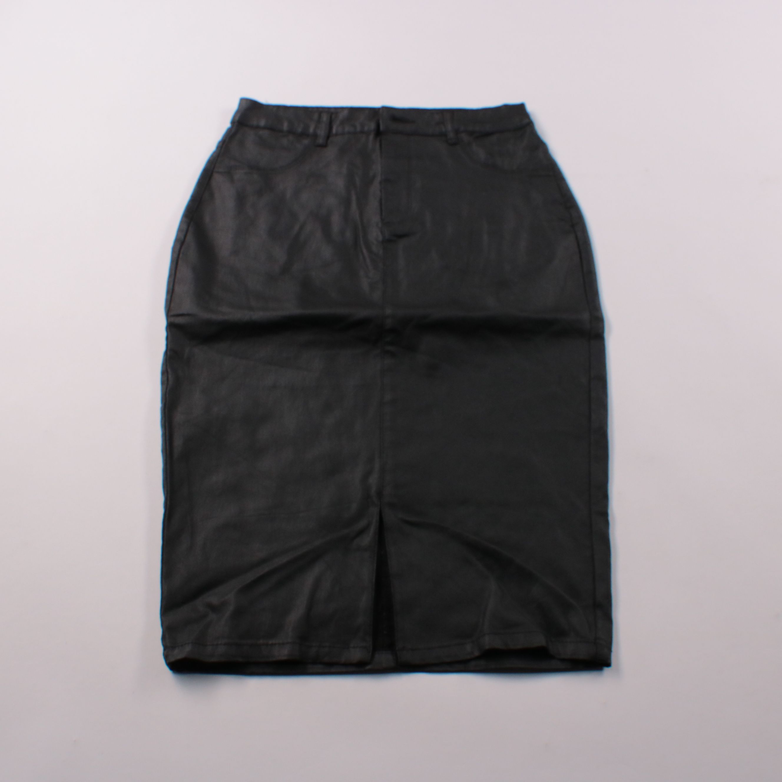 Юбка-карандаш Denim Co. из гладкого материала под кожу, чёрного цвета, со шлицей сзади. Подойдёт для офиса и повседневных образов с рубашкой или свитером. Практичный вариант: легко комбинируется и не требует сложного ухода.