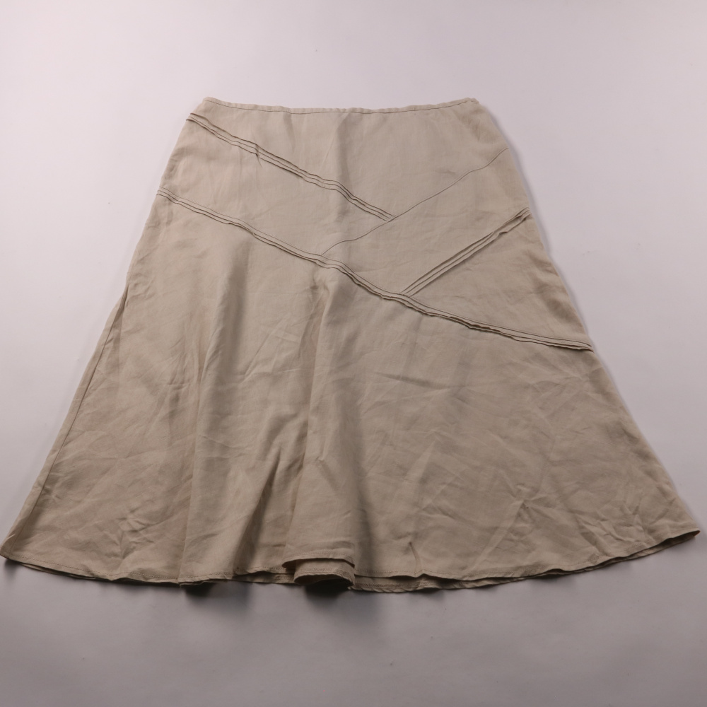 Льняная юбка Maine New England бежевого цвета с расклешённым силуэтом и декоративными диагональными швами. Подойдёт для летних прогулок и отпуска, легко сочетается с футболками и рубашками. Натуральный лён хорошо дышит и комфортен в жару.