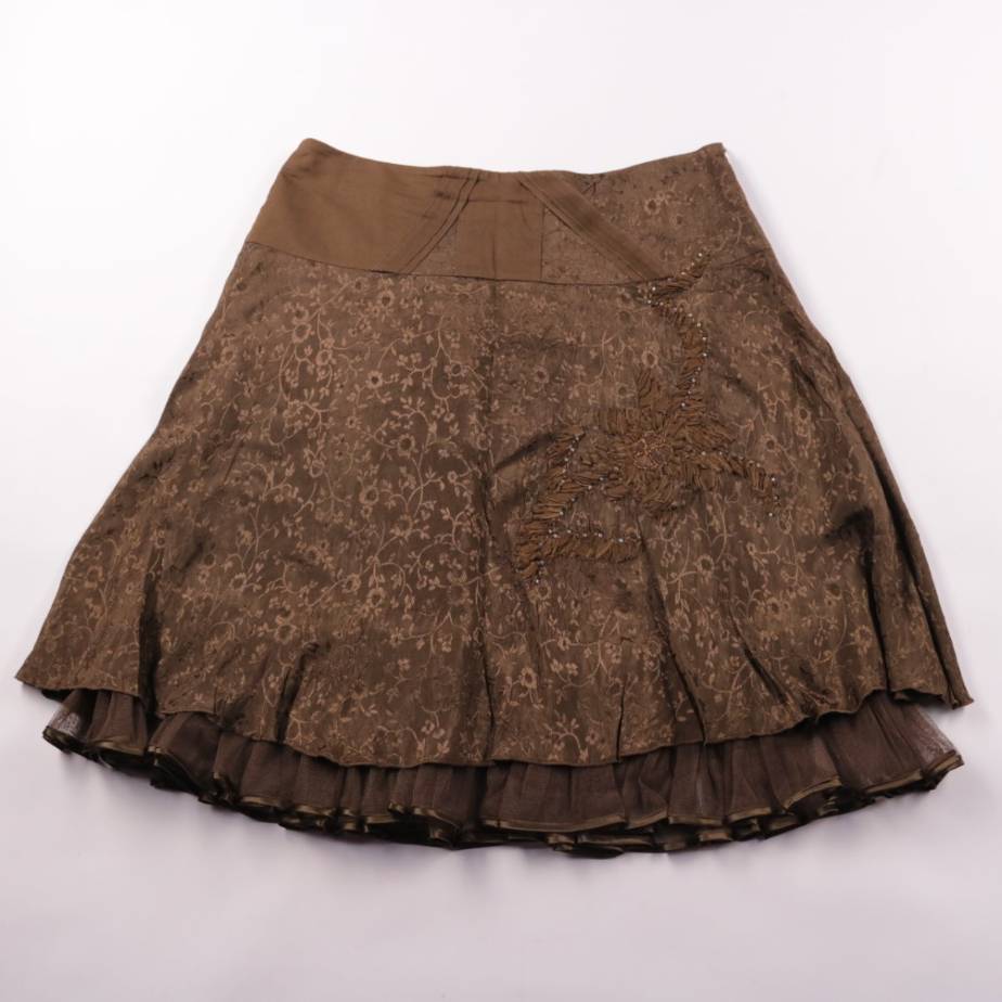 Юбка Taifun коричневого цвета с цветочным жаккардовым узором и декоративной вышивкой/бисером спереди. Подойдёт для повседневных образов и выхода, красиво сочетается с однотонными блузками и водолазками. Модель на подкладке, поэтому комфортно сидит и не...
