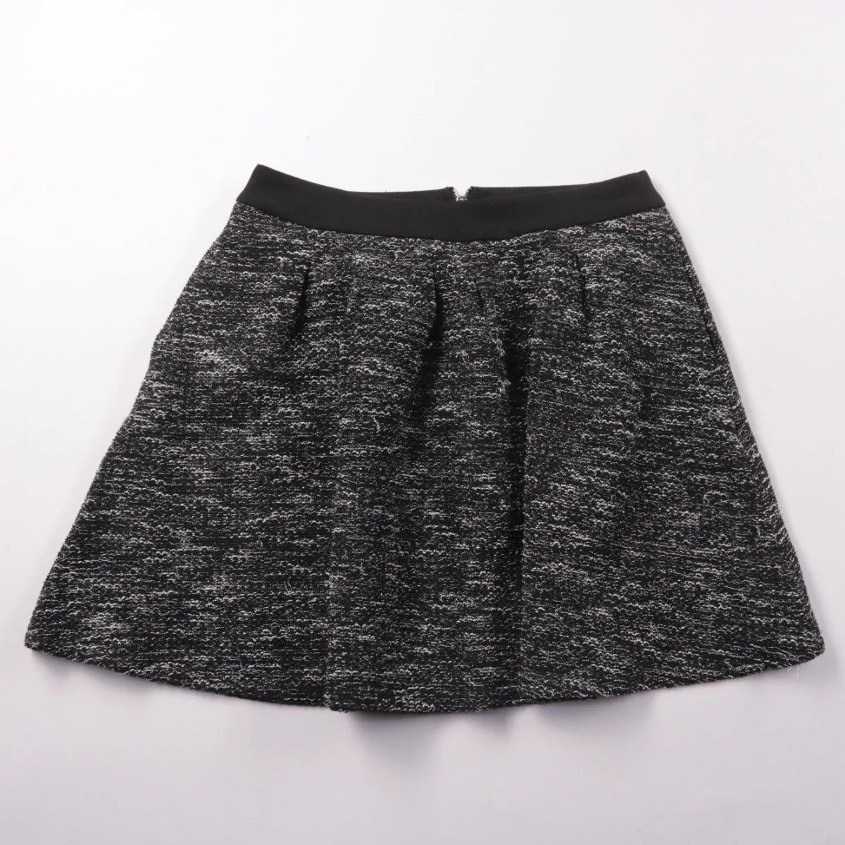 Юбка Amisu расклёшенного кроя из фактурного твида/трикотажа меланж в серо-чёрной гамме, с поясом и складками спереди. Подойдёт для офиса и повседневных образов с водолазкой или рубашкой. Плотный материал держит форму и меньше мнётся в носке.