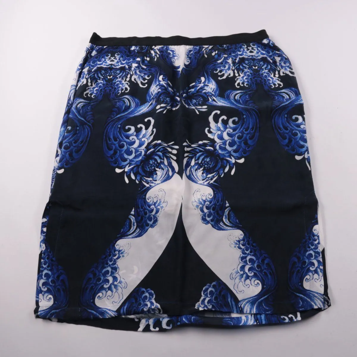 Женская юбка Ulla Popken Selection с эластичным поясом и ярким абстрактным принтом в сине-бело-чёрных тонах. Подойдёт для повседневных образов и офиса с однотонным верхом. Лёгкая ткань и подкладка делают посадку более комфортной.