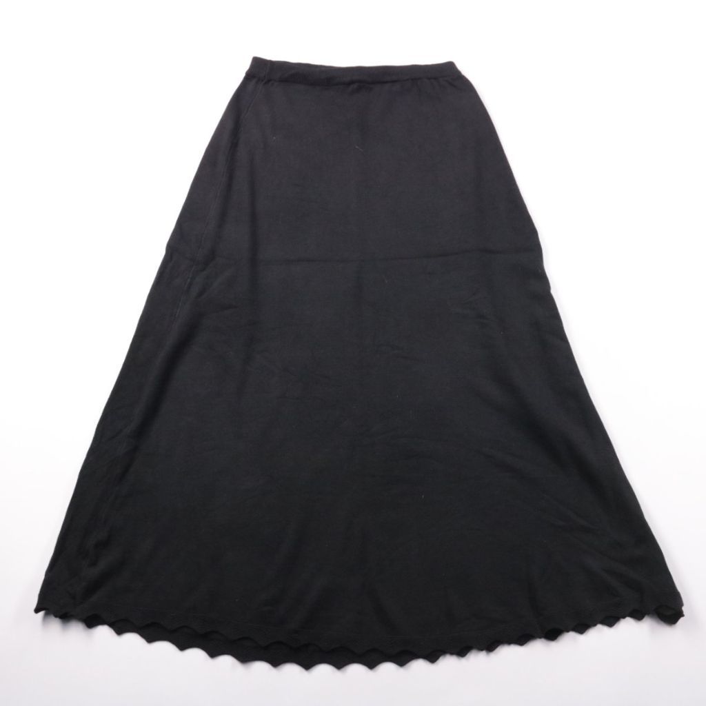 Длинная чёрная юбка D&Z Fashion А-силуэта с эластичным поясом и фигурным (волнистым) краем по низу. Подойдёт для повседневных образов и спокойного офисного дресс-кода, легко сочетается с блузками и джемперами. Практичный плюс — тянущаяся ткань на основ...