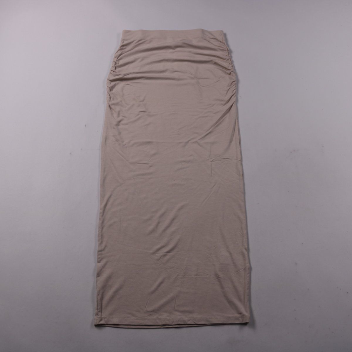 Длинная облегающая юбка Gina Tricot бежевого цвета с драпировкой по бокам в верхней части. Подойдёт для повседневных образов и на выход, хорошо сочетается с топами и жакетами. Трикотаж на основе вискозы с эластаном мягкий и тянется, поэтому комфортно сидит по фигуре.